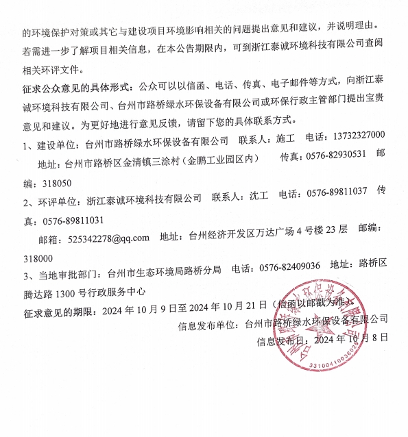 臺州市路橋綠水環保設備有限公司廢酸一體化綜合利用擴建項目環境影響評價信息公示